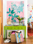 This artwork isn’t just really cool, it is a mantra for whomever lives here and sets a tone for who they are. The soft beige and kind words create a design that makes you stop, read and smile. The large basket lends warmth and texture with the weave and the blue blanket is a nice pop of color in an otherwise neutral space. This is a small but welcoming spot to pop your shoes off (and put them in the basket) and head on in.